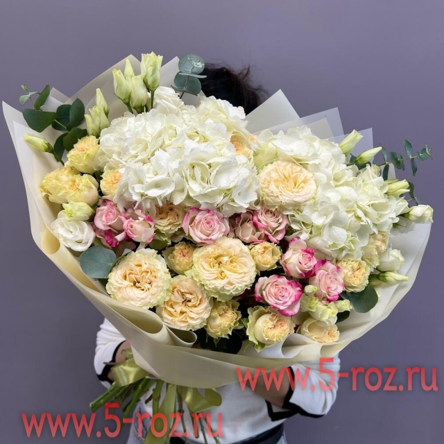 Эвкалипт - 2 шт. Гортензия белая - 2 шт. эустома белая - 4 шт. Кустовая роза рефлекс - 3 шт. роза кустовая пионовидная саммер - 5 шт. руссус 15 шт .упаковка дизайнерская Ширина - 43 см Высота - 50 см