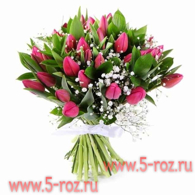 В составе: букета 25 розовых тюльпанов, 3 гипсофилы, руссус 10.упаковка 1