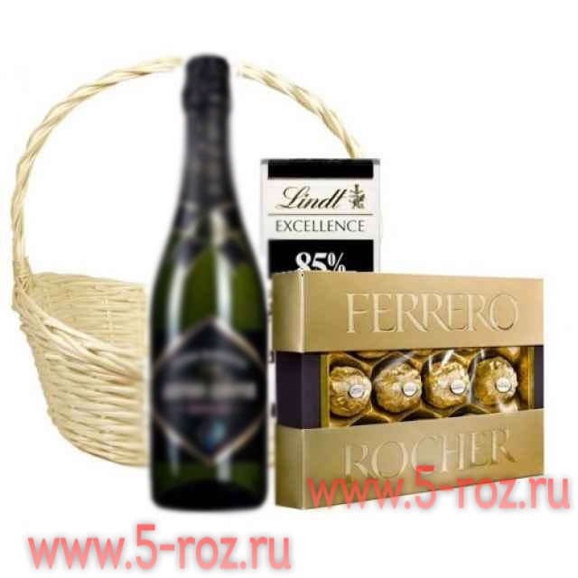 В подарочную корзину входят следующие компоненты: конфеты “Ferrero Rocher”; Шоколад LINDT Еxcellence, 100 гр.; корзина с оформлением Данное изображение носит ознакомительный характер и может отличаться от реальности. Напиток поставляется с корзиной только лицам не моложе 18 лет. Вы можете добавить к корзине свои напитки или заказать у нас услугу доставки. Для индивидуального расчета по корзинам обращайтесь к менеджерам 5-roz@bk.ru или +79219060281 - (whatsapp).(viber) +79219669574