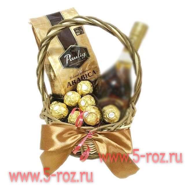 В состав корзины входит: Кофе в зёрнах «Paulig» (Арабика) Шоколадные конфеты «Ferrero Rocher» Декор Корзина упакована в прозрачную пленку с золотым бантом подарок Данное изображение носит ознакомительный характер и может отличаться от реальности. Вы можете добавить к корзине свои напитки или заказать у нас услугу доставки, которая может быть осуществлена только для лиц не моложе 18 лет. Для индивидуального расчета по корзинам обращайтесь к менеджерам 5-roz@bk.ru или +79219060281 - (whatsapp).(viber) +79219669574