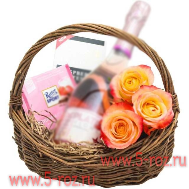 В состав корзины входит: Шоколад «Ritter Sport» Горький шоколад «Lindt» Розы — 3 шт. Декор Корзина упакована в прозрачную плёнку с бантом. подарок Данное изображение носит ознакомительный характе р и может отличаться от реальности. Вы можете добавить к корзине свои напитки или заказать у нас услугу доставки, которая может быть осуществлена только для лиц не моложе 18 лет. Для индивидуального расчета по корзинам обращайтесь к менеджерам 5-roz@bk.ru или +79219060281 - (whatsapp).(viber) +79219669574